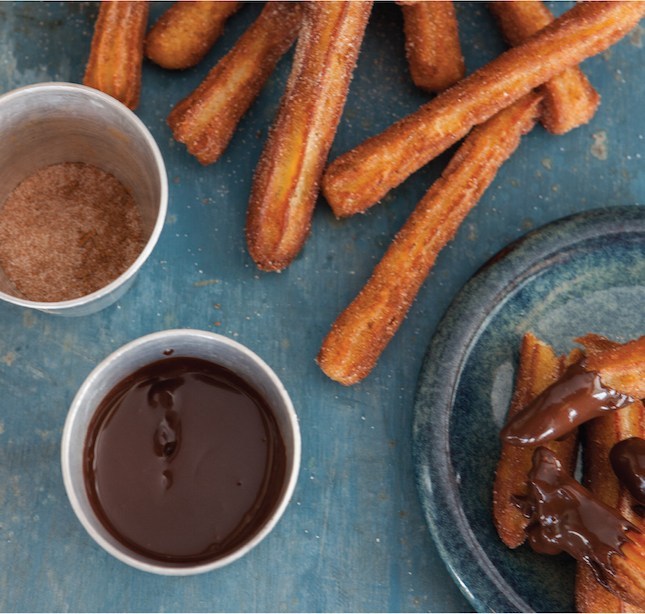 In Mexico today, churros and hot chocolate are sold for breakfast from many a roadside food stall. At La Boca Loca, we serve churros with individual small dishes of warm orange-chocolate sauce for maximum dipping pleasure.